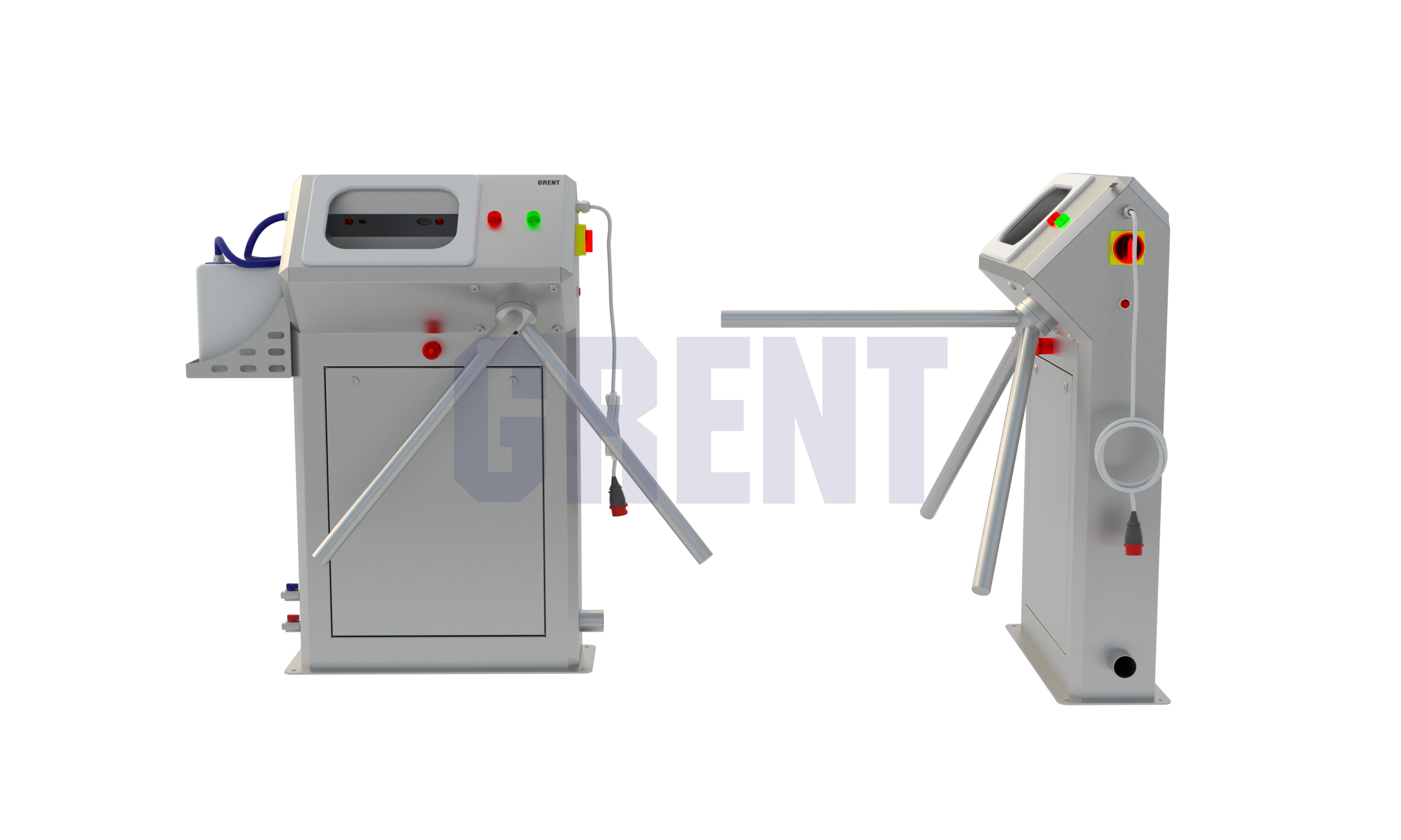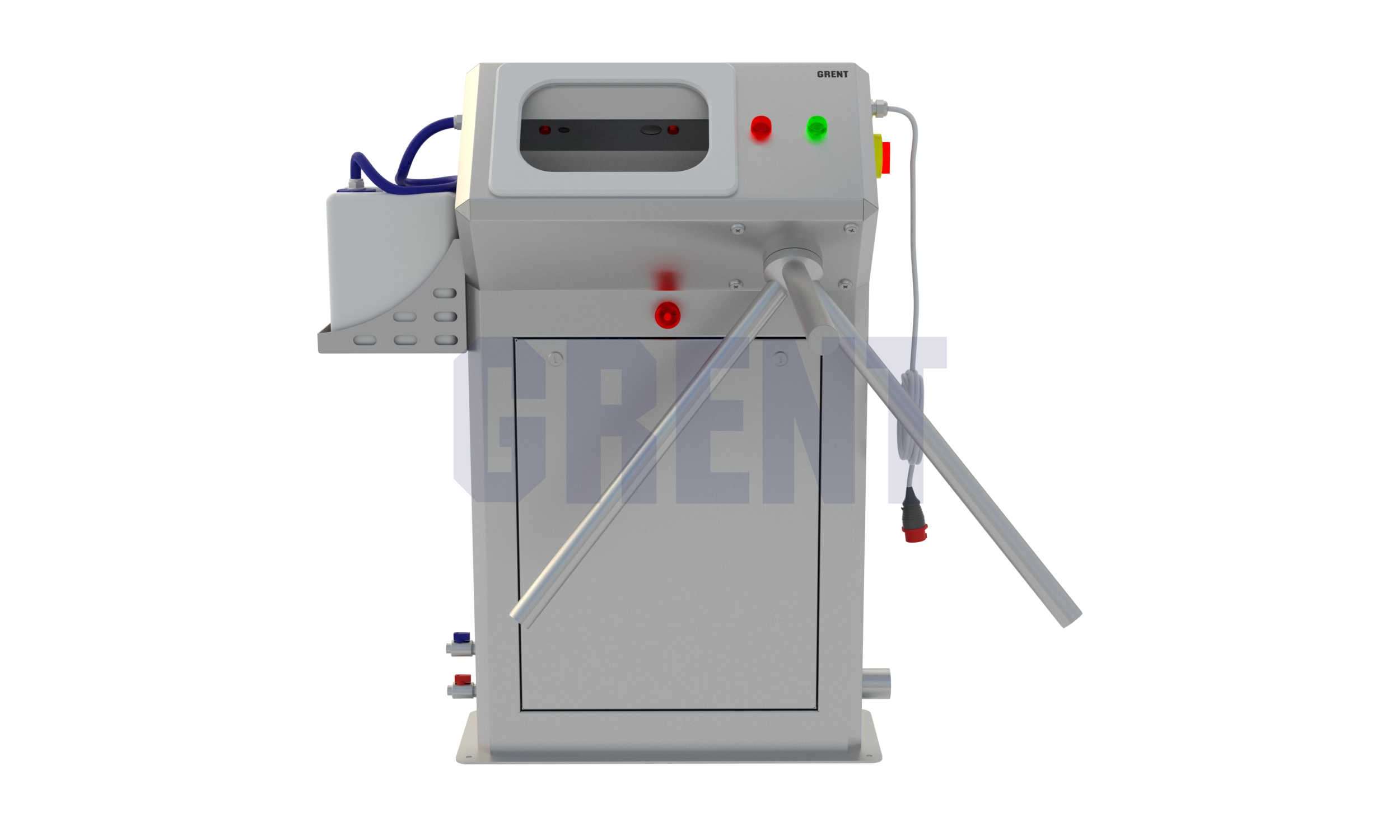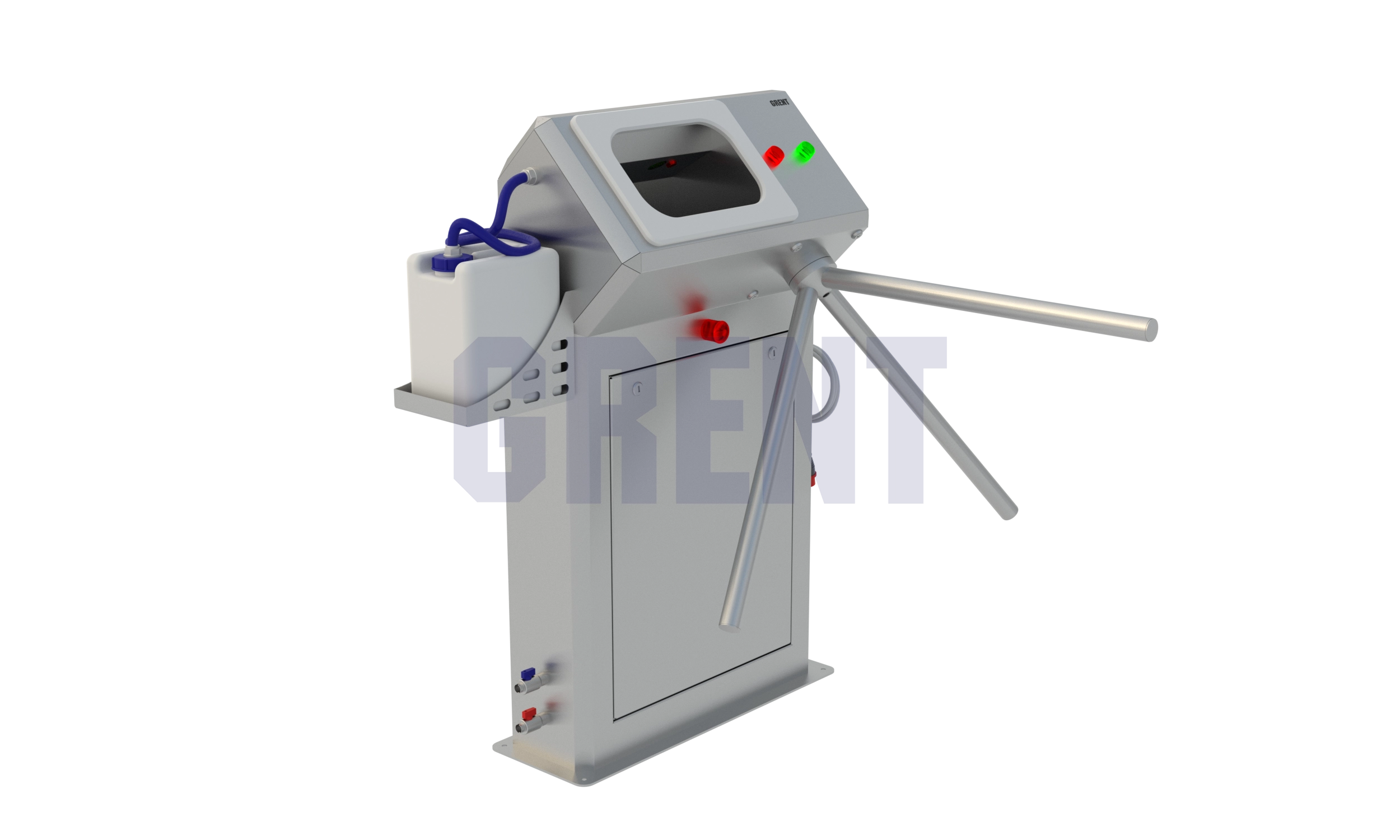 Станция гигиены рук GRENT 013 R предназначена для автоматической бесконтактной подачи мыла, а затем подачей воды персоналу перед подходом к блоку дезинфекции. Включение подачи мыла происходит при поднесении рук в зону срабатывания первого фотоэлемента, расположенного в камере. Жидкое мыло подается автоматически при помощи электронасоса. Подачу мыла осуществляет одна форсунка, расположенные в верхней части камеры.Затем при поднесении  рук срабатывает подача воды, после чего открывается турникет.