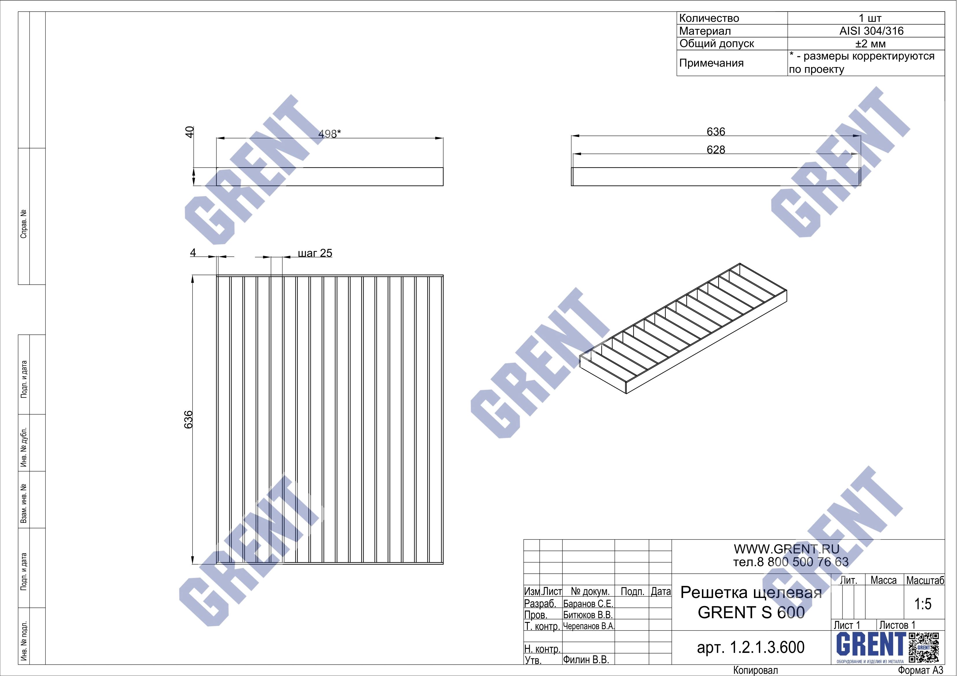 Гидравлическое сечение – 600 мм.Материал – нержавеющая сталь AISI 304 / AISI 316